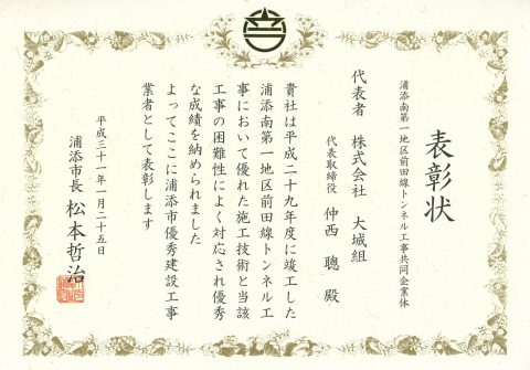 2019.02.6 優秀建設業者賞 受賞 お知らせ 浦添市優秀建設業者・表彰を頂きました 物件名:浦添南第一区前田線トンネル工事 お知らせ Xmasイルミネーション! 前の記事 大城組勤務 ☆43年 無事卒業! 次の記事